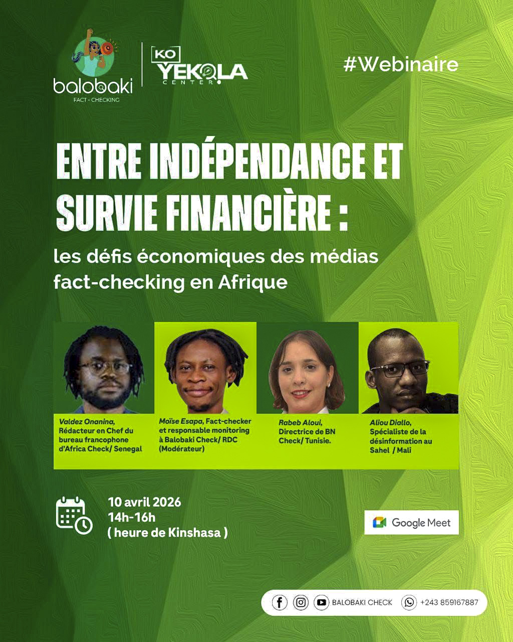 Ce 10 avril 2026, un webinaire organisé par Balobaki Check a réuni plusieurs experts africains du fact-checking autour d’une question centrale : comment garantir l’indépendance éditoriale tout en assurant la viabilité financière. À travers des expériences concrètes, les intervenants ont mis en lumière les défis quotidiens auxquels font face les médias de fact-checking en Afrique, tout en proposant des pistes pour renforcer leur crédibilité et leur résilience.