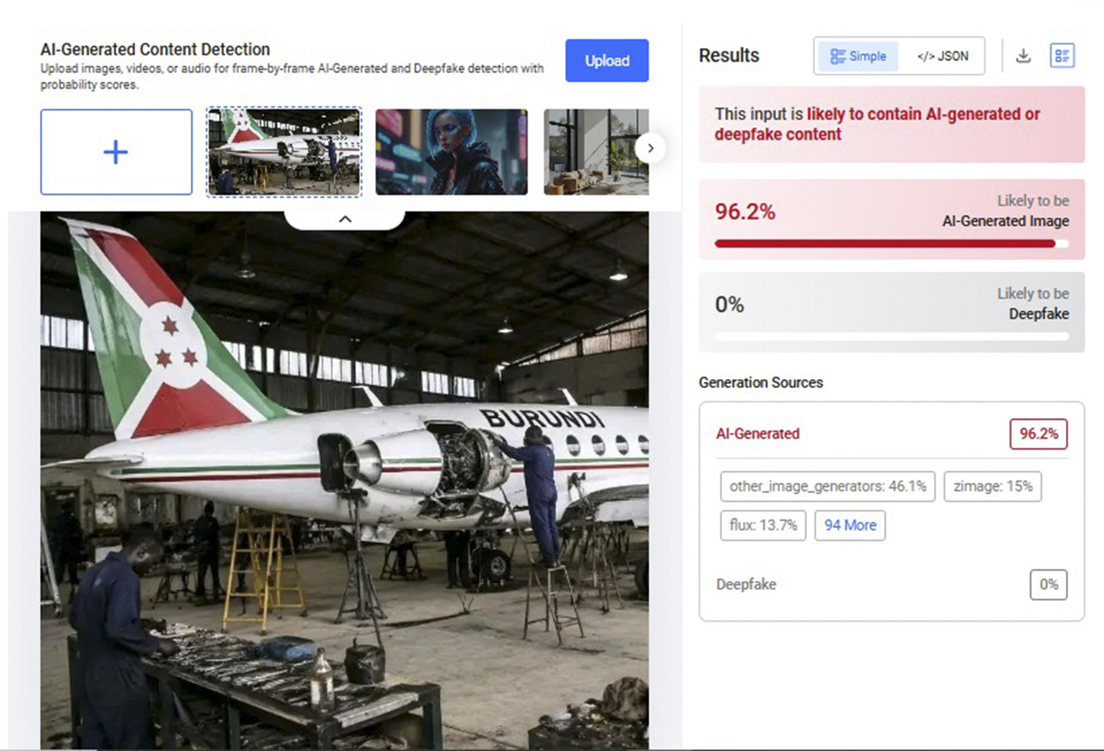 Une image prétendant montrer un avion burundais en cours de réparation n’est pas authentique. Après vérification, les résultats indiquent que cette image a été générée par une intelligence artificielle.